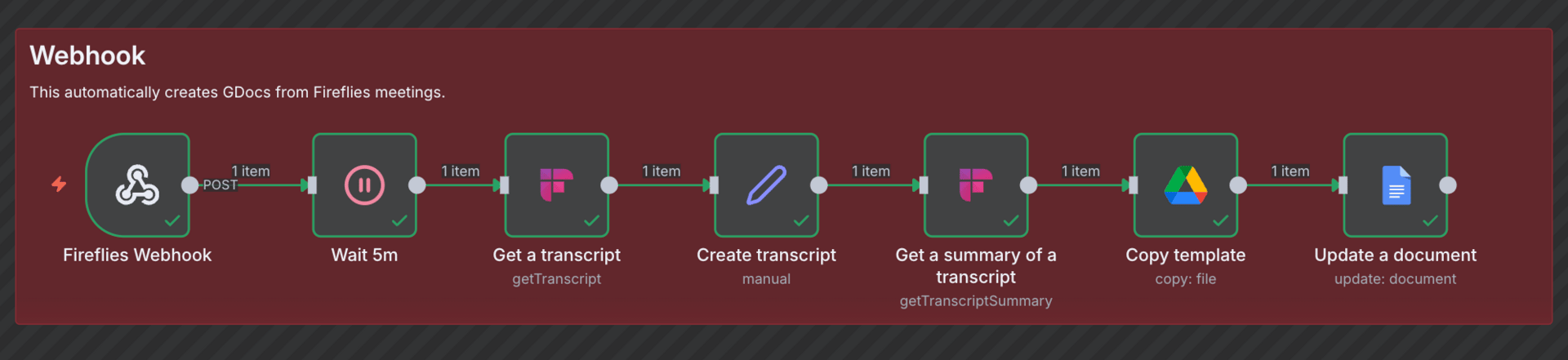 The above automation in n8n triggers when a Fireflies meeting recording ends. It waits 5 minutes to allow time for the AI-generated meeting summary and action items. It then uses Fireflies to grab the full meeting transcript and the AI-generated summary and action items. The workflow creates a Google Doc and saves the information into my specified meetings folder.