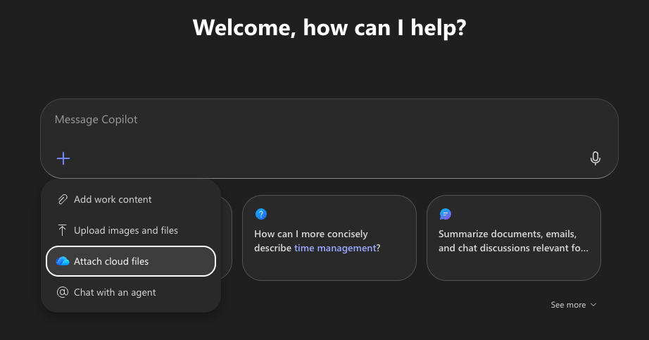 In Copilot Chat, you can click the plus icon and select “Attach cloud files” to link to your files in SharePoint.