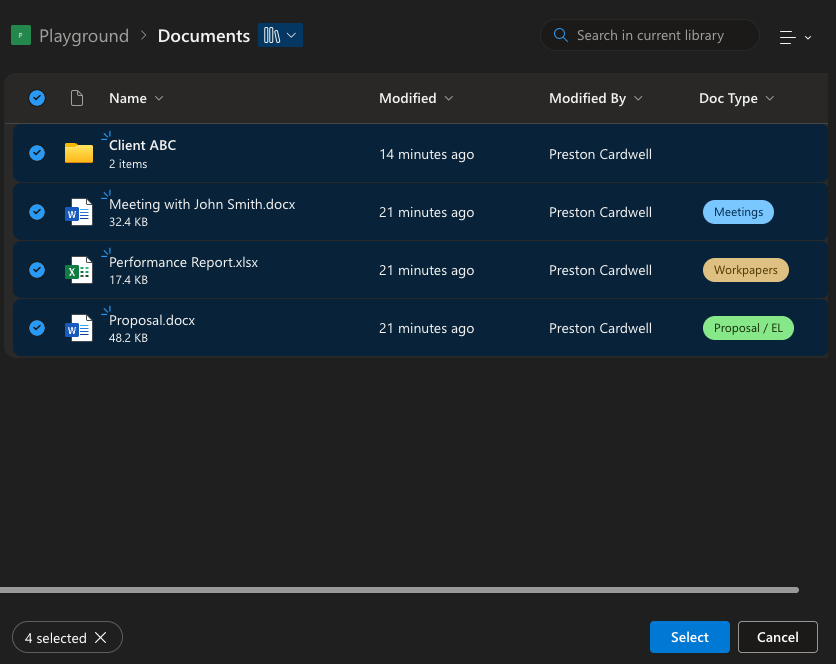 From there, you can select a SharePoint site. In my case, I’ve selected my Playground SharePoint site. You can select all files, specific files, or a specific folder.