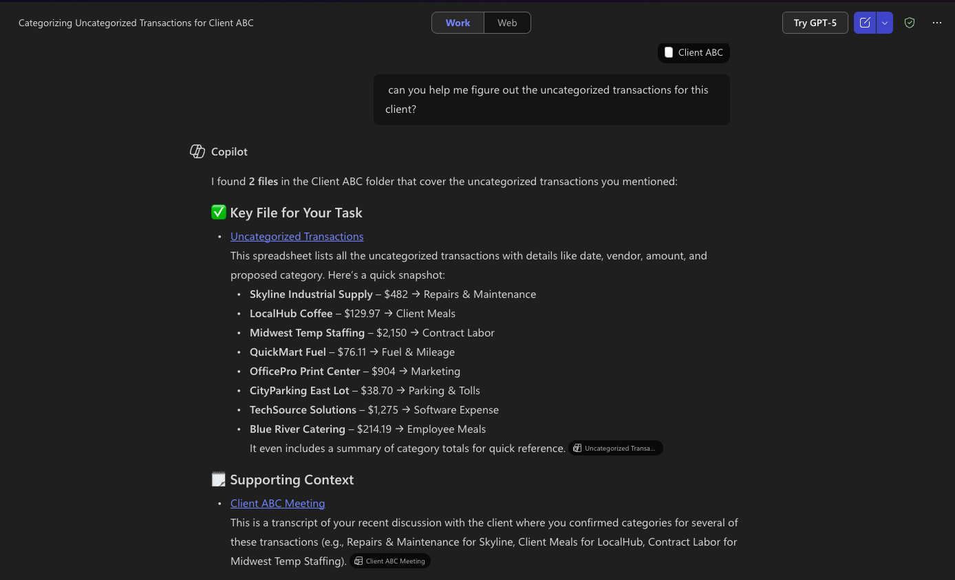 You can then ask questions about the information in your SharePoint site. In the example below, I selected the “Client ABC” folder. The answer came back correct and complete within a few seconds, and also linked the files it used to answer the question.