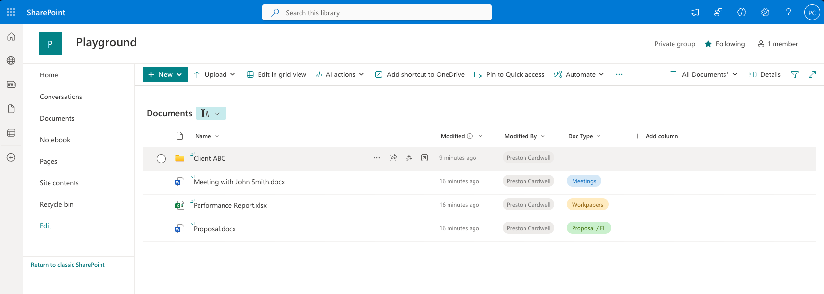 Below is an example of a SharePoint site with a few documents and one folder. I highly recommend keeping folder structures simple (e.g., do not nest a lot of folders). I also recommend utilizing a Document Type metadata field (simply click “+ Add column”). Not only can the Document Type field help you sort and filter files, but it helps AI quickly understand and determine the relevant files needed to answer your question.