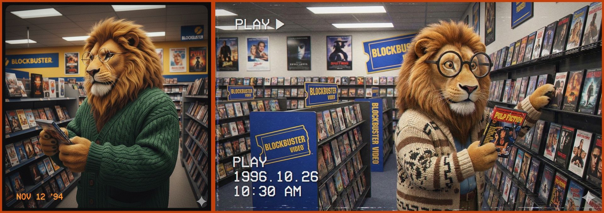 Prompt: Create an image of an anthropomorphic lion wearing oversized round glasses and a cardigan sweater, browsing DVDs in a Blockbuster, shot on a 1990s VHS camcorder.